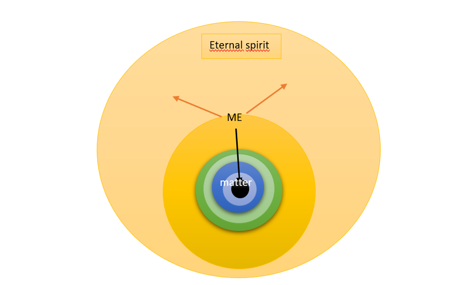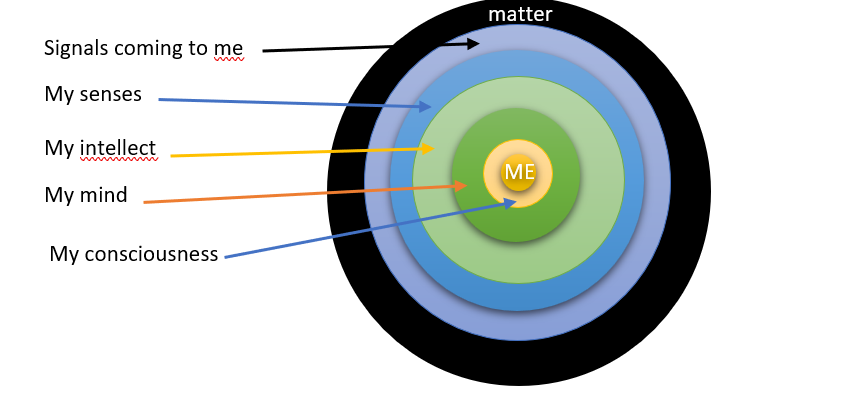 The ego, ignorant of existing as a ripple in unchanging and infinite consciousness, only able to look inwards, seeing only the limited show of objects and change, says: these impressions all come to ME, so I must be at the centre of the world looking out at it. To the ego the world looks like this.