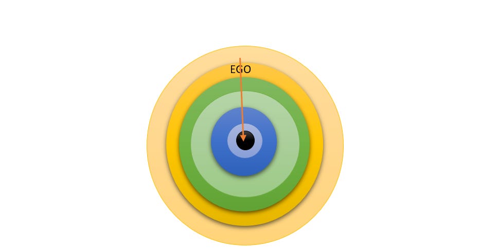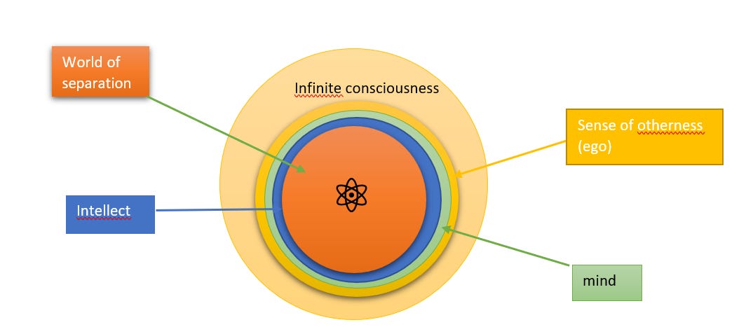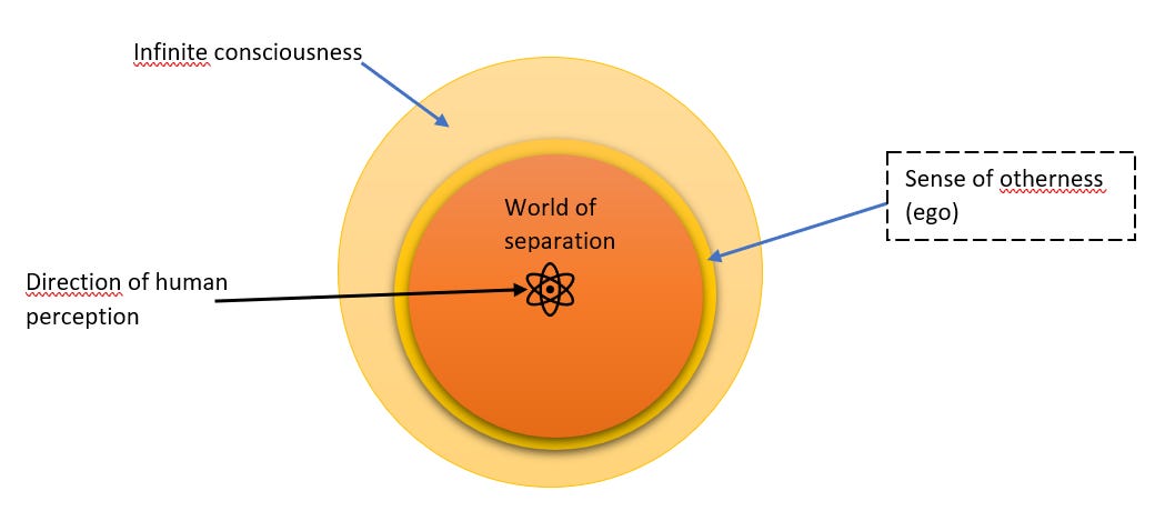 Whereas the ego is in fact an optical lens/ filter of perception defining the circumference of the world, through which infinite consciousness is looking into concentric and diminishing spheres, providing a narrowing perspective and the impressions of denser reality.