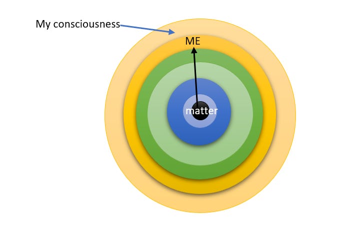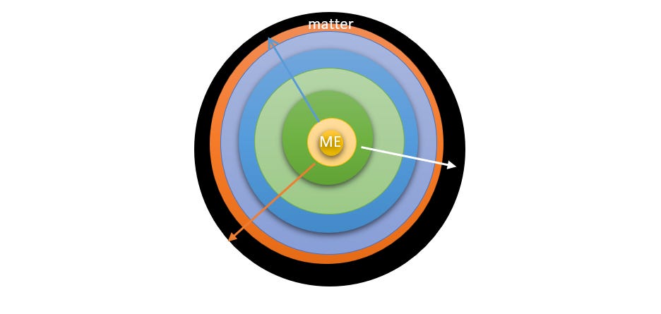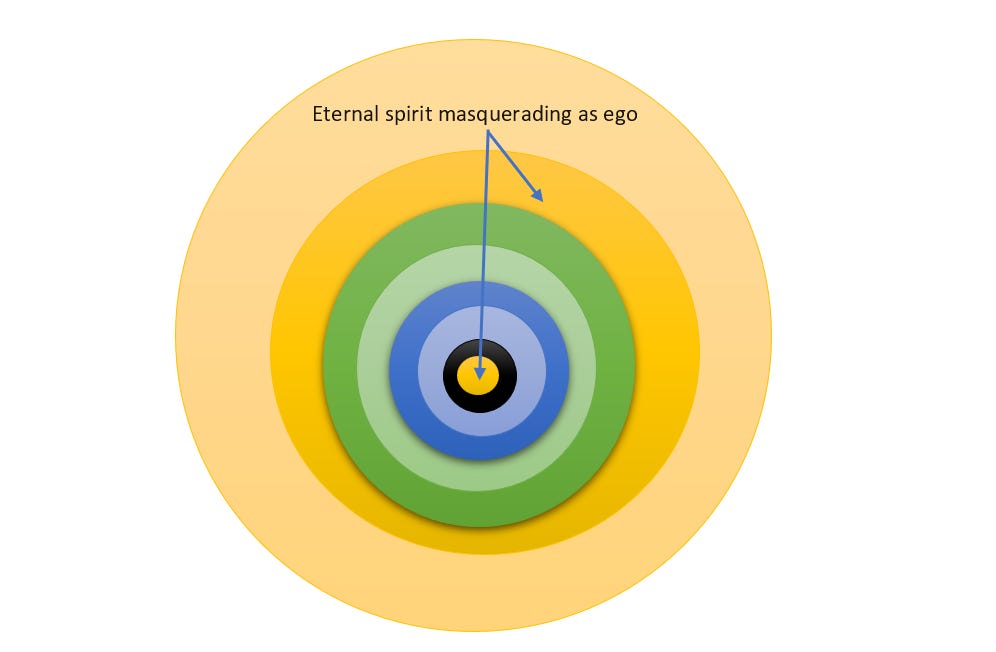 Seen as concentric circles, each more aware and subtle than the previous, each containing the lower levels of manifestation, we can picture it like this.