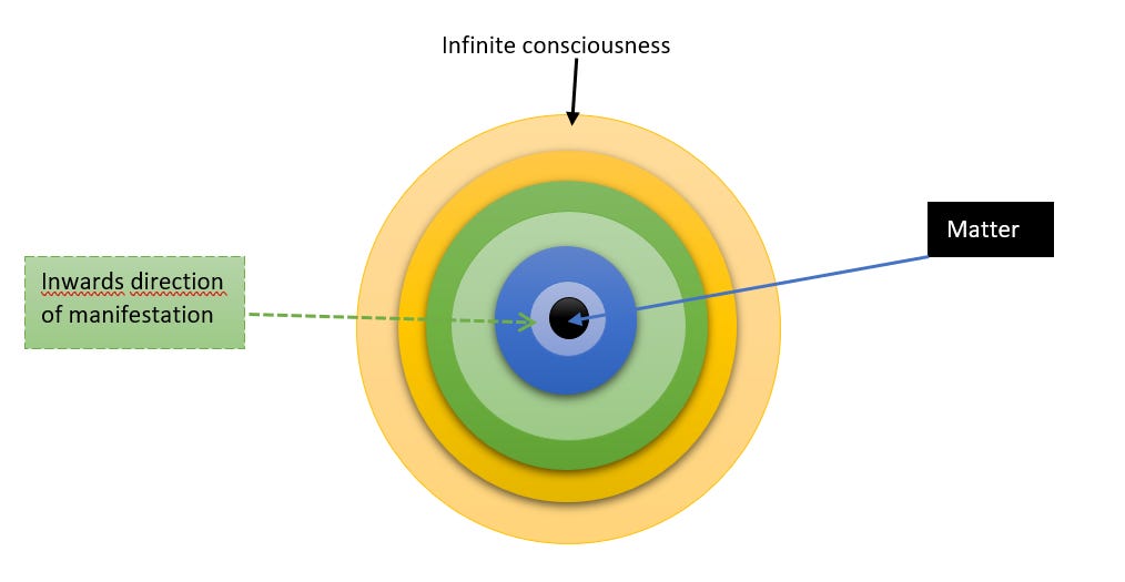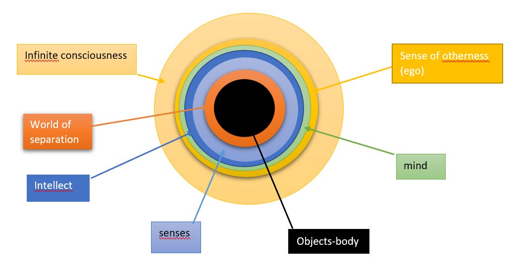 Does reality then manifest inwards from the line of sense of otherness (ego) and splits up into smaller and smaller concentric circles of mind, intellect, senses and finally the dense realm of body-matter?