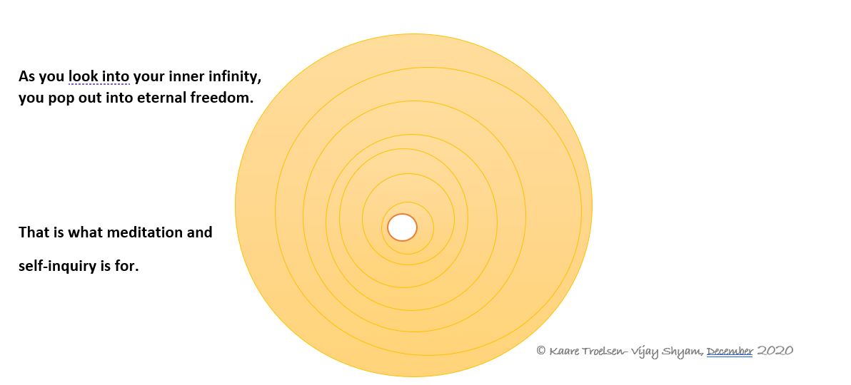 "When we “look out” through our senses, we are in fact looking into a small world of appearances. When we look inwards (in meditation) we are in fact looking out into the infinite field of being?