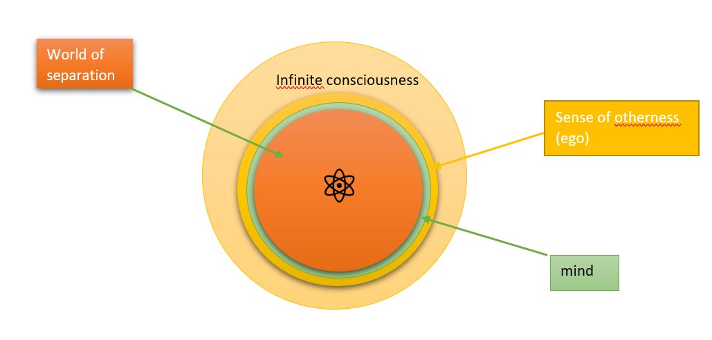 This world is the illusory ability of universal consciousness to identify with an imagined part of itself. The first part to be imagined is the ego, the sense of otherness.