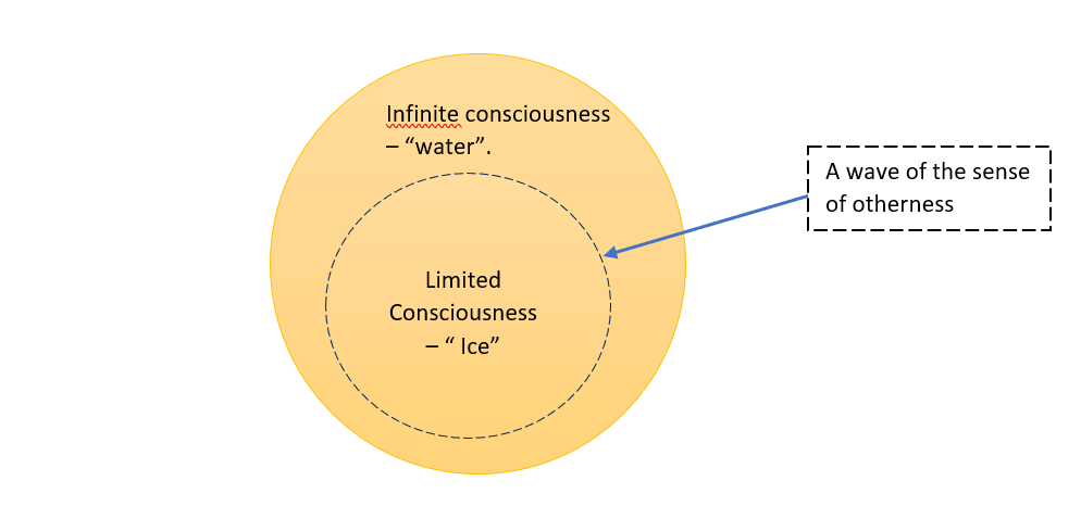 Let’s make a thought experiment. Imagine that the world grows inwards instead. Inwards in a field of pure potential. Like water freeze inwards when subjected to external cold. Like ice cubes form. Maybe the world begins with pure energy/ infinite consciousness which experience a simple wave of change (like cold for the water). Cold does not remove water, it just changes the molecular grid structure of water, we now call it ice, but it is still H2O (which, like all matter, is nothing but 99,9% emptiness and 0,1 % vibration of that emptiness). This illusion, that a part of water is no longer water, is nothing but a sensory perception, which gives rise to the words: water, ice, snow, etc. Now, if we imagine the beginning of everything as a clear expanse of infinite water. In it, a change, a primordial delineation appears to happen. A line of difference emerges. We perceive of it as real, just as we see ice as different from water. This first wave of apparent change is the non-biological sense of otherness. In humans we call the sense of otherness for ego.